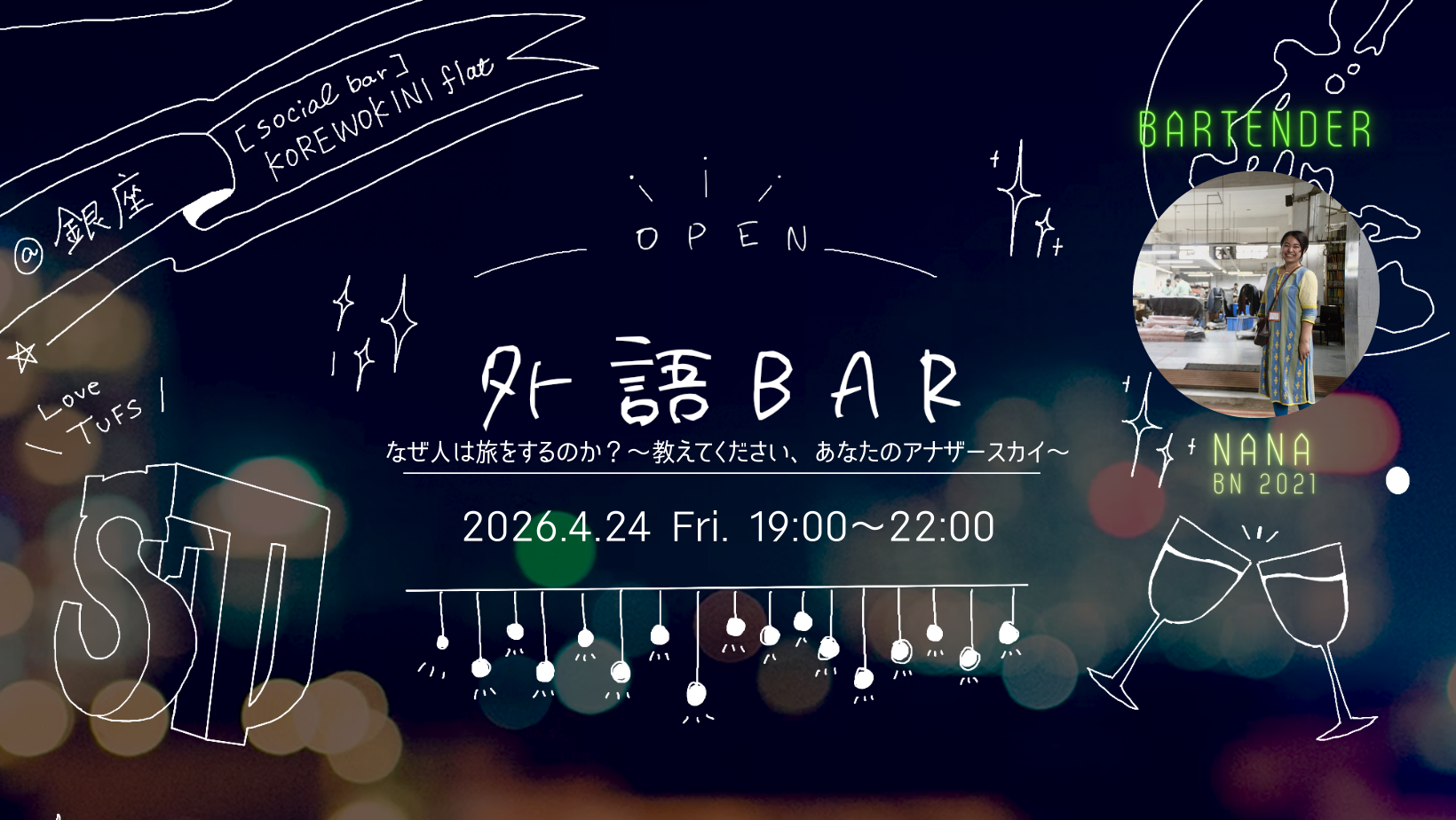 3回目のバーテンダーです。会社でツアーを企画しながら「旅をつくるっていいな〜」と思って、外大の皆さんのお気に入りの場所を聞きたくなりバーテンに応募しました。