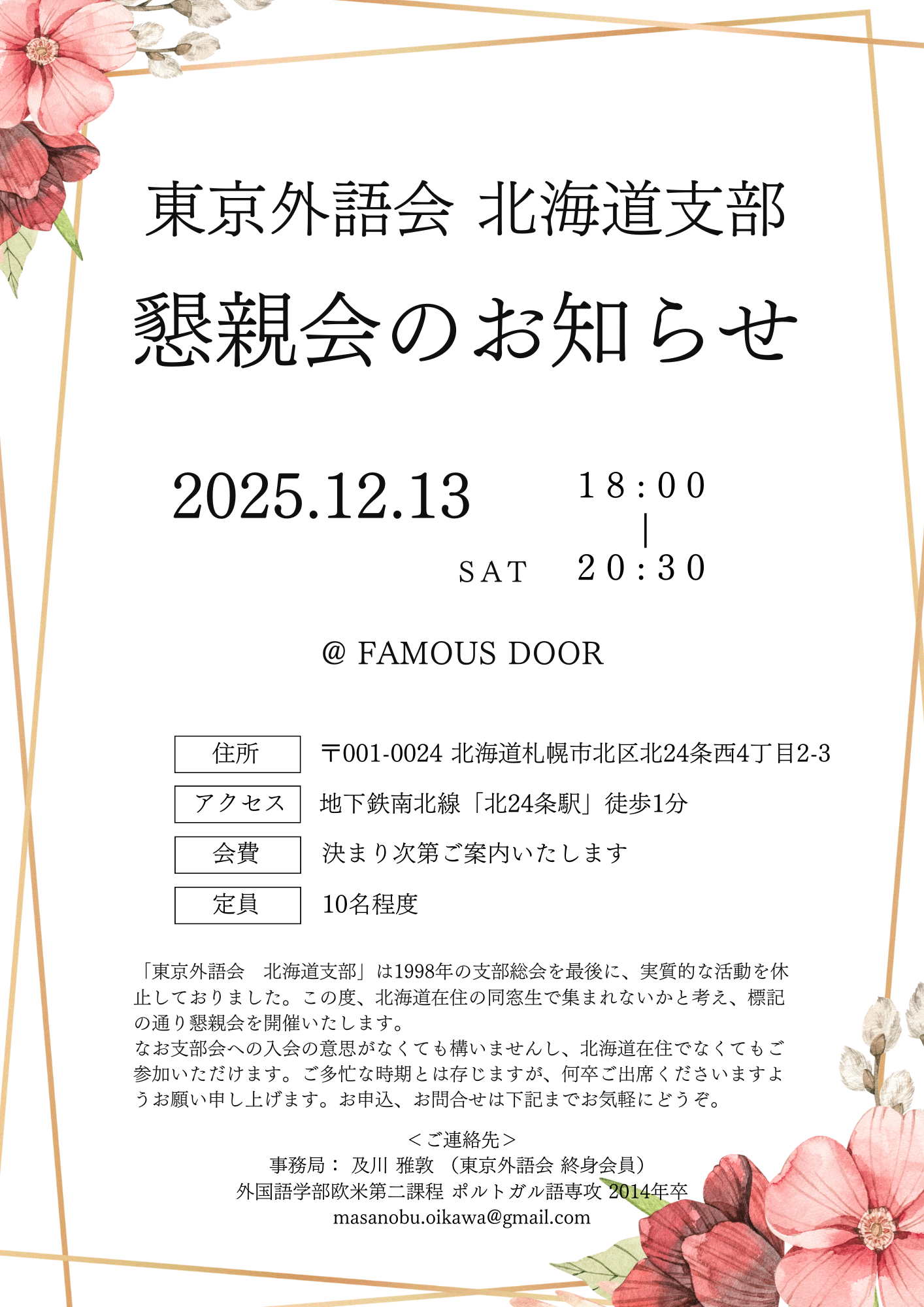 この度、「東京外語会 北海道支部」の活動再開に向けた懇親会を来る12月13日(土)に開催したいと存じます。