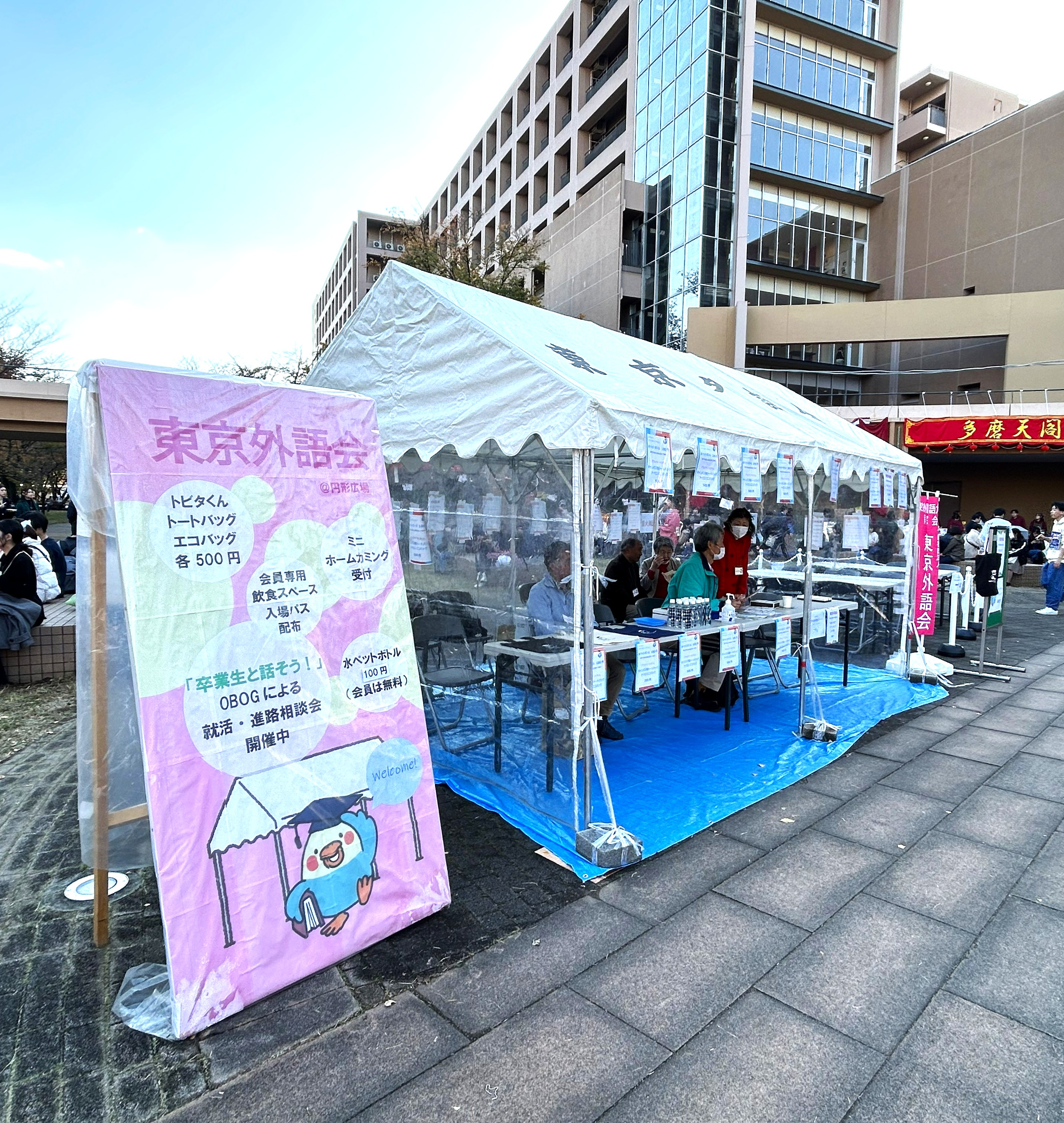 外語祭(11月20~24日)にお越しの際は 円形広場にある『外語会テント』に是非お立ち寄りください。 外語会テントでは ・アラムナイトビタくんトートバッグ・エコバッグの販売 ・水ペットボトルの販売(会員証提示で無料) ・外語会員専用飲食スペースへの入場パス配布 ・「卒業生と話そう!」OBOG×在学生懇談会 ・「ミニホームカミング」の受付 ・その他各種会員サービス を行っています。 皆様のお越しをお待ちしています!