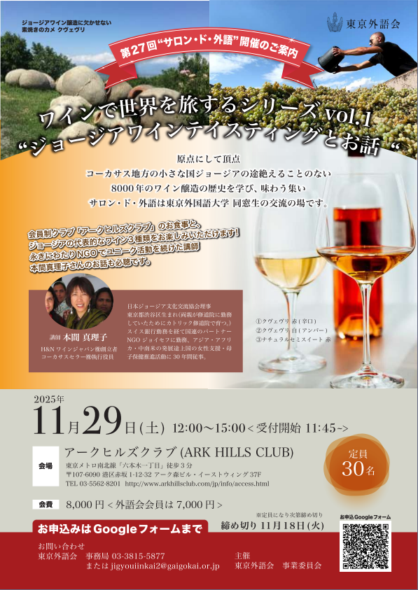 会員制クラブ アークヒルズクラブのクラブランチと、ジョージアの代表的なワイン3種類をお楽しみいただけます!永きにわたりNGOでユニークな活動を続け、ジョージアワインのインポーターでもある、講師 本間真理子さんのお話も必聴です。