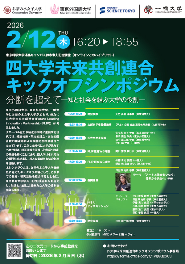 このたび、新体制でのスタートを記念し、2026年2月12日(木)にキックオフシンポジウムを開催いたします。本シンポジウムは、お茶の水女子大学を新たに迎えたキックオフの場として、これまでの教育・研究活動を紹介するとともに、対話と共創を通じた新たな大学の役割について展望する機会とします。